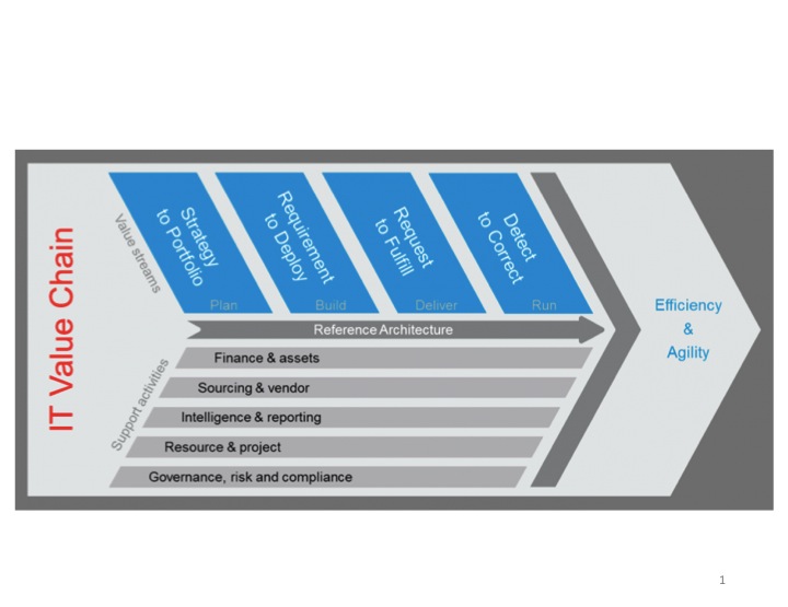 The issue we were debating is whether a reference model should have one value chain or many (and if many – how many). The IT4IT reference model only has one value chain – Strategy to portfolio (plan), Requirement to deploy (build), Request to fulfill (deliver), Detect to correct (run) – all aimed at one value proposition “efficiency and agility”.