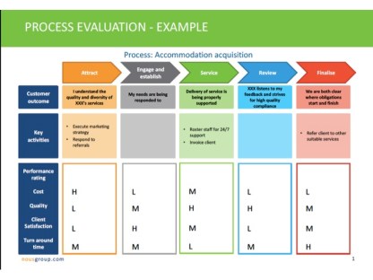 In response to my recent post on the Process Owner Grid,  Richard Rawling responded that he frequently uses a tool called Process Evaluation Grid.    This tool also has the process laid out along the top of the grid – same as my adjusted Process Owner Grid.  The difference is that down the side of the grid are listed performance evaluation criteria, such as customer satisfaction and cost – see example from Nous Group.